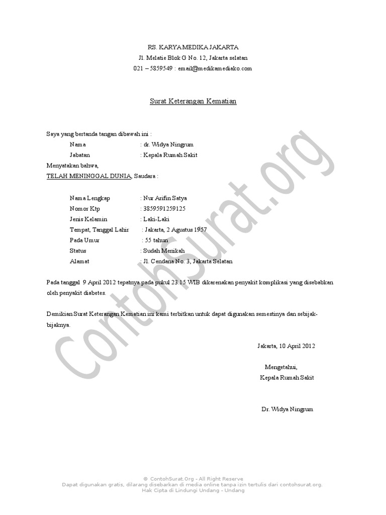 Contoh Surat Keterangan Kematian Di Rumah Sakit Contoh Surat from assets.kompasiana.com Sekilas memang surat keterangan mirip dengan surat surat pernyataan, tapi sebenarnya beda. Dengan mencari langsung contohnya di google mungkin kita bisa mendapatkan format surat keterangan kematian yang kita butuhkan jika kita menggunakan kode di atas. 100% based on 99998 ratings. Namun beberapa bank hanya melayani pembuatan rekening untuk masyarakat yang berdomisili di daerah pelayanan bank tersebut. Semoga ulasan dan contoh format doc (word) dan pdf yang kami lampirkan dalam artikel ini dapat berguna untuk anda yang membutuhkan. Download & view contoh surat keterangan kematian rumah sakit as pdf for free. Untuk membuat surat pernyataan bisa baca contoh surat pernyataaan. Demikian surat keterangan kematian ini kami terbitkan untuk dapat digunakan semestinya dan sebijakbijaknya.